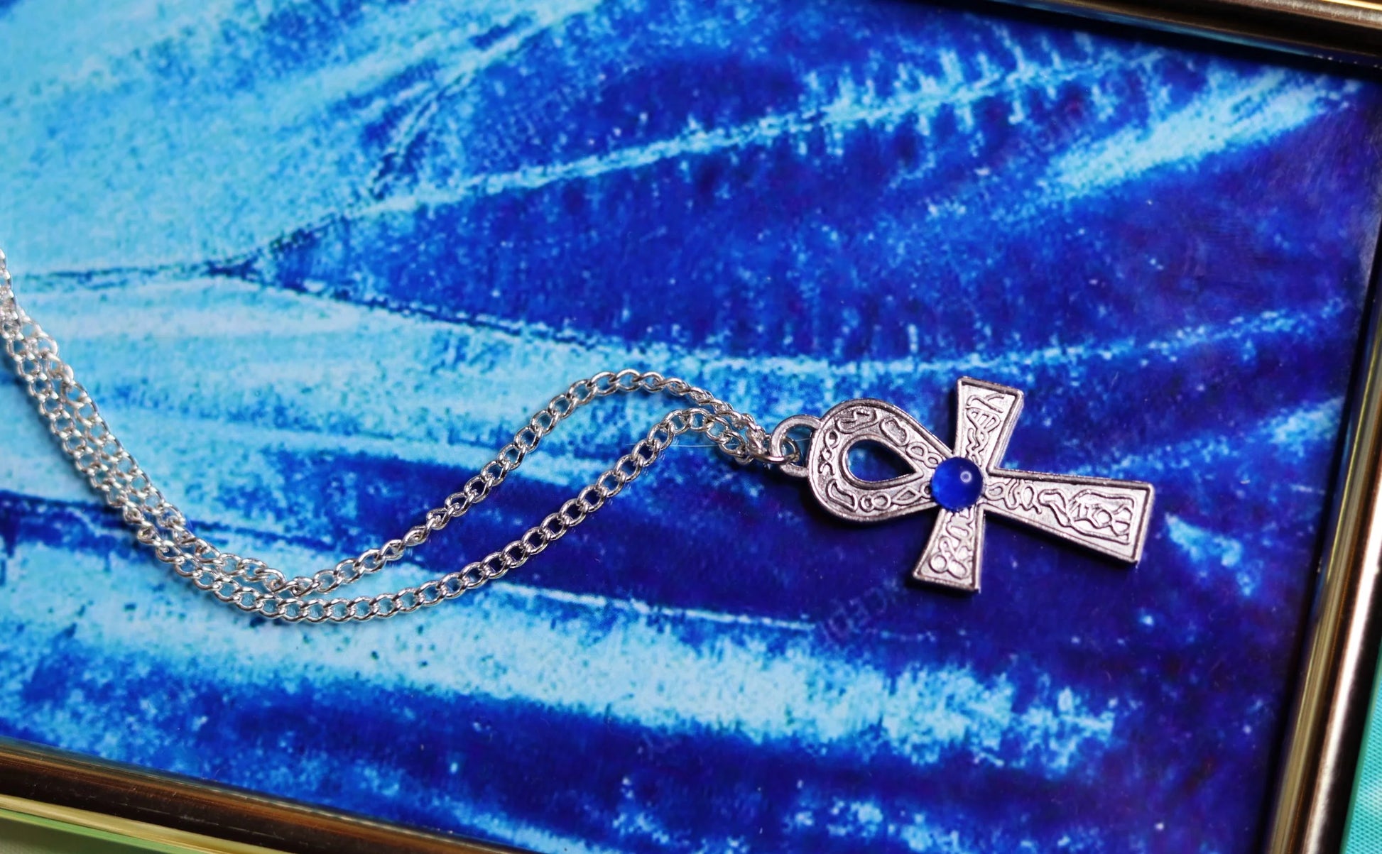 Ankh ( Key of Life ) necklace, silver plated with an indigo cabochon adorning the center