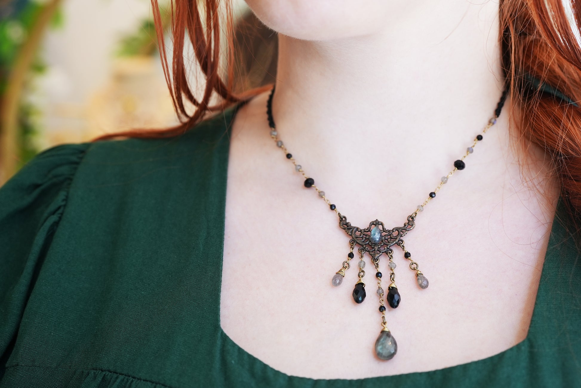 Art Nouveau Gothic Labradorite & Onyx Necklace