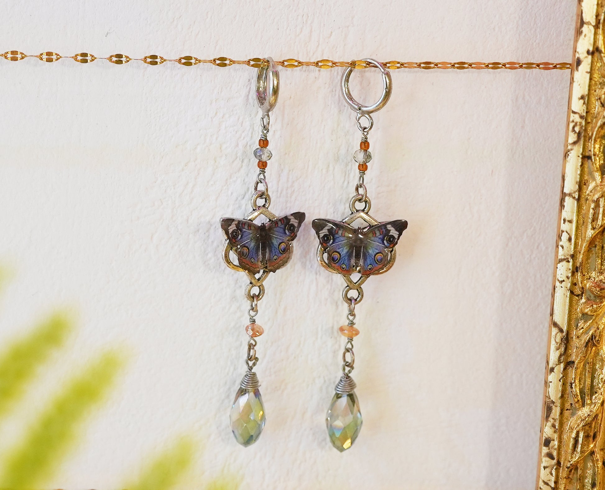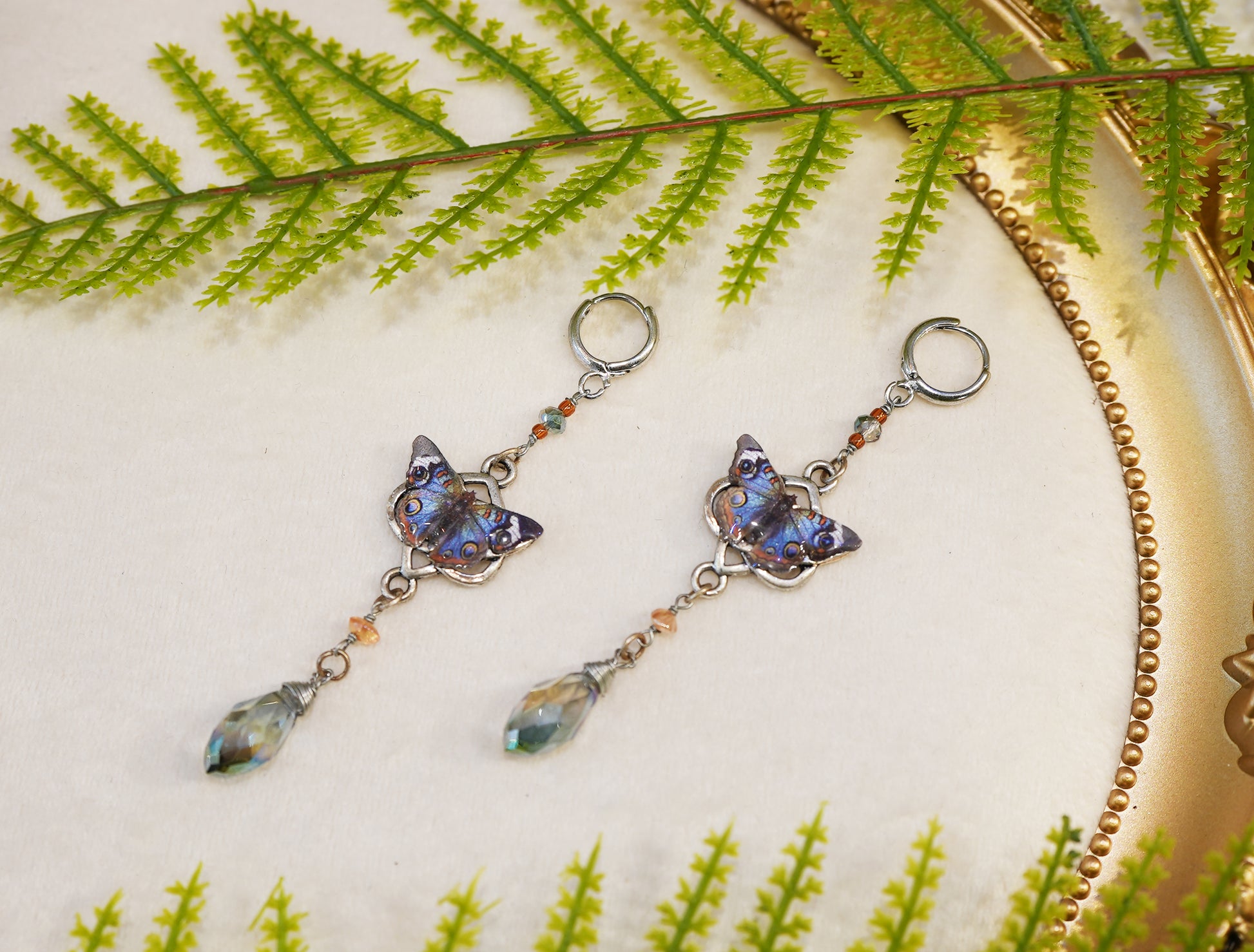 Blue Buckeye Butterfly resin coated earrings, adorned with silver plated celtic charms, hypoallergenic rhodium ear levers & glass beads.