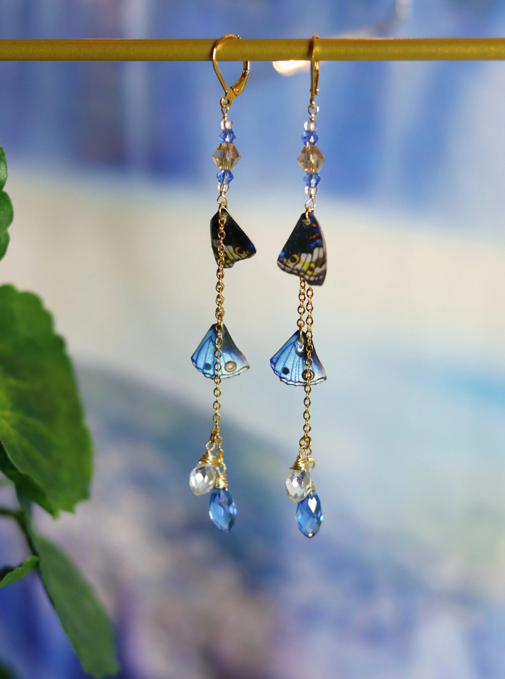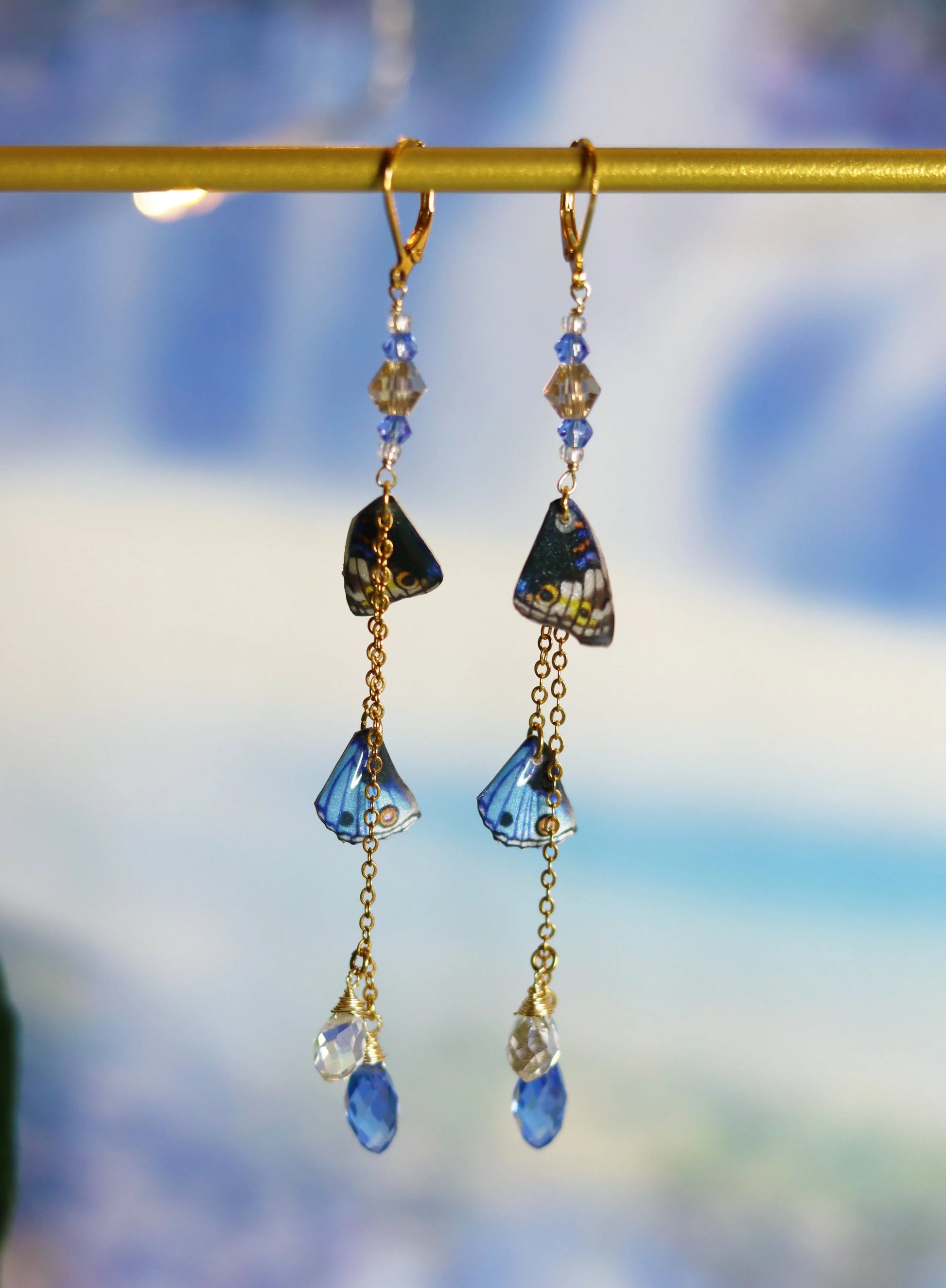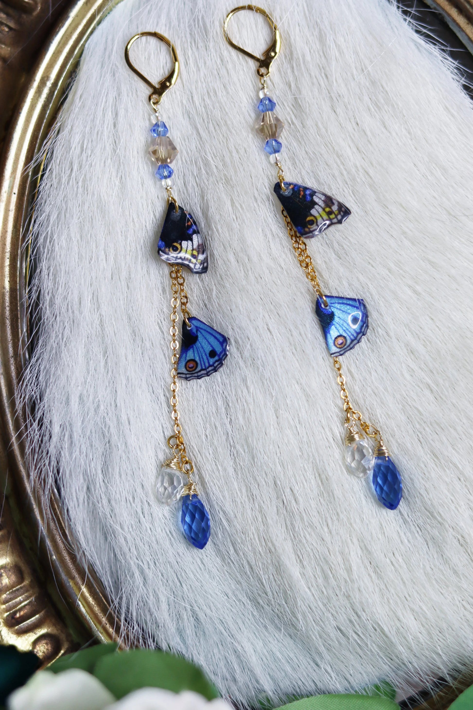 Blue Pansy ( Junonia orithya ) resin butterfly earrings , adorned with 24 k gold plated chains, iridescent and blue beads & 24 k gold plated ear hooks