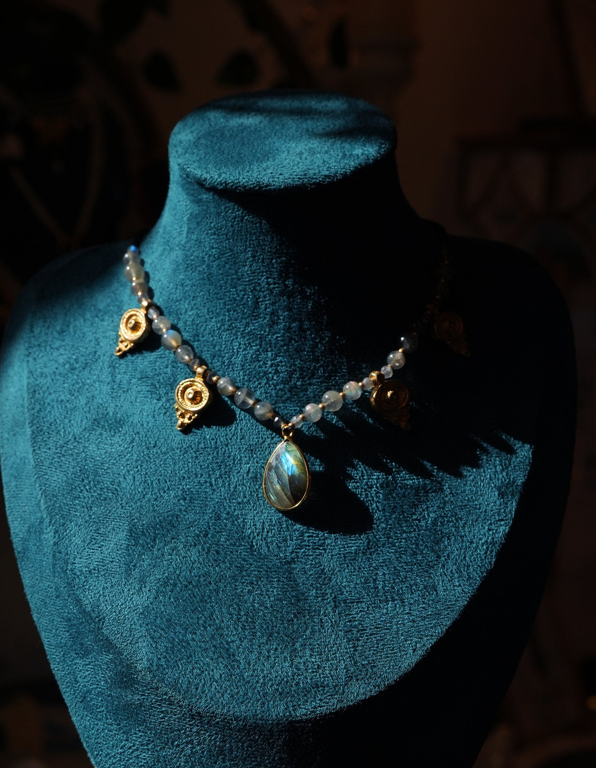 Labradorite Necklace/ Choker with tribal brass beads, 24 k gold plated beads, galvanized seed beads & AAA+ labradorite beads and electroplated connector. All is woven with macrame thread which is adjustable in length in the back.