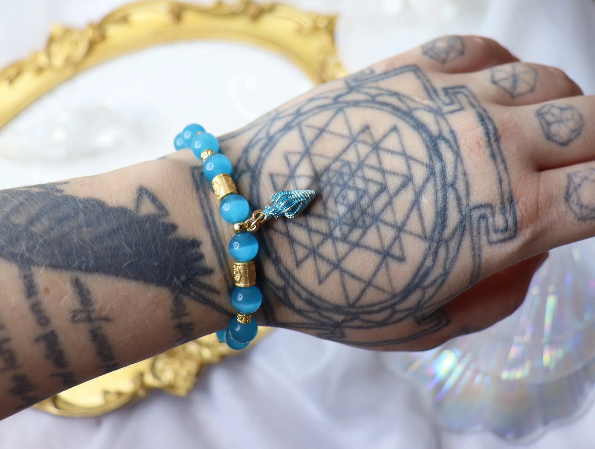 Sea Shell cat's eye beaded bracelet with 24 k gold plated beads and blue shell accent.